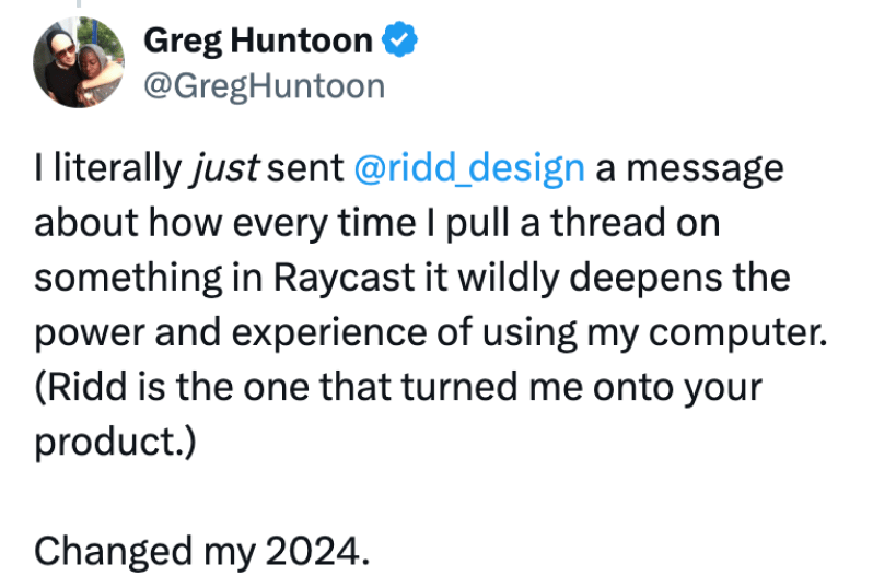 So I want to highlight someone who started using Raycast after hearing about it on Dive Club 👇